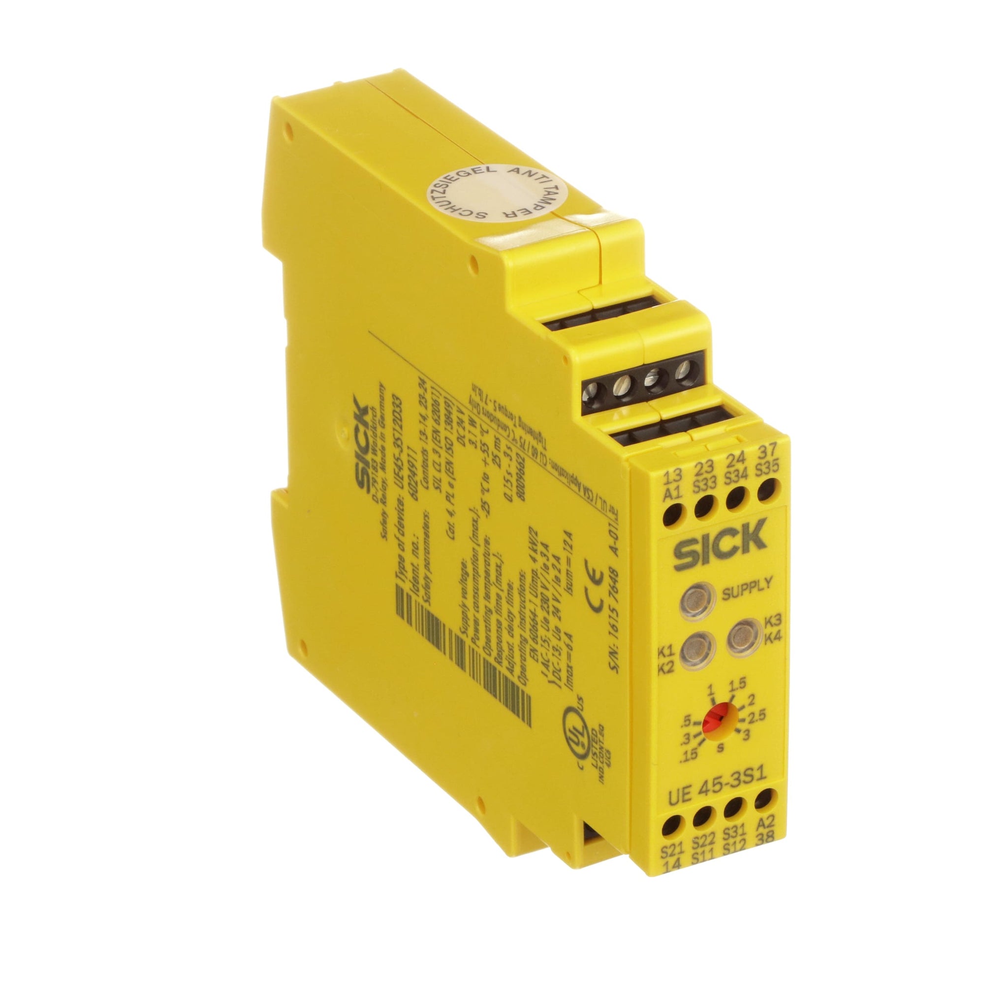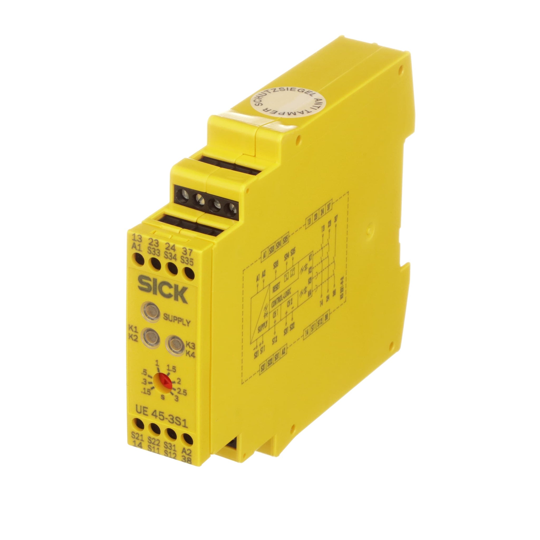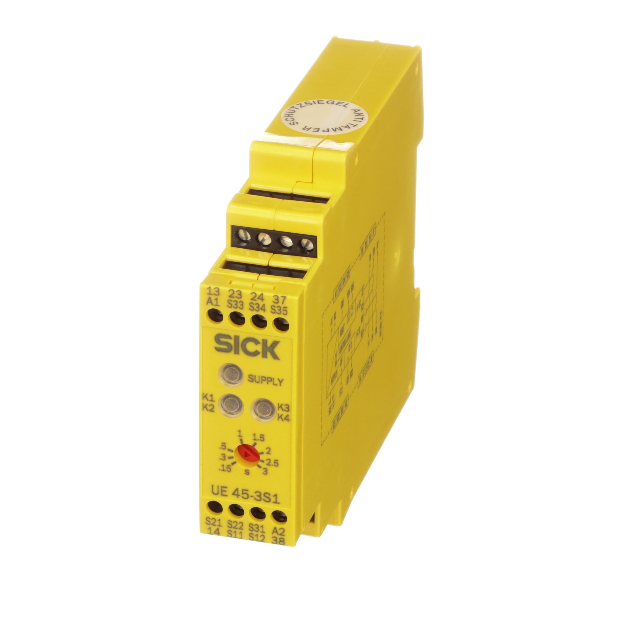 The UE45-3S1 safety relay monitors safety switches and emergency stop pushbuttons in applications with a safety brake. It offers 2 safety contacts, which directly switch off some of the actuators. The other actuators must be active until the machine has come to a complete stop. These actuators can be deactivated after a certain time. This ensures the brake stops the machine, allowing access once the machine has come to a complete stop.