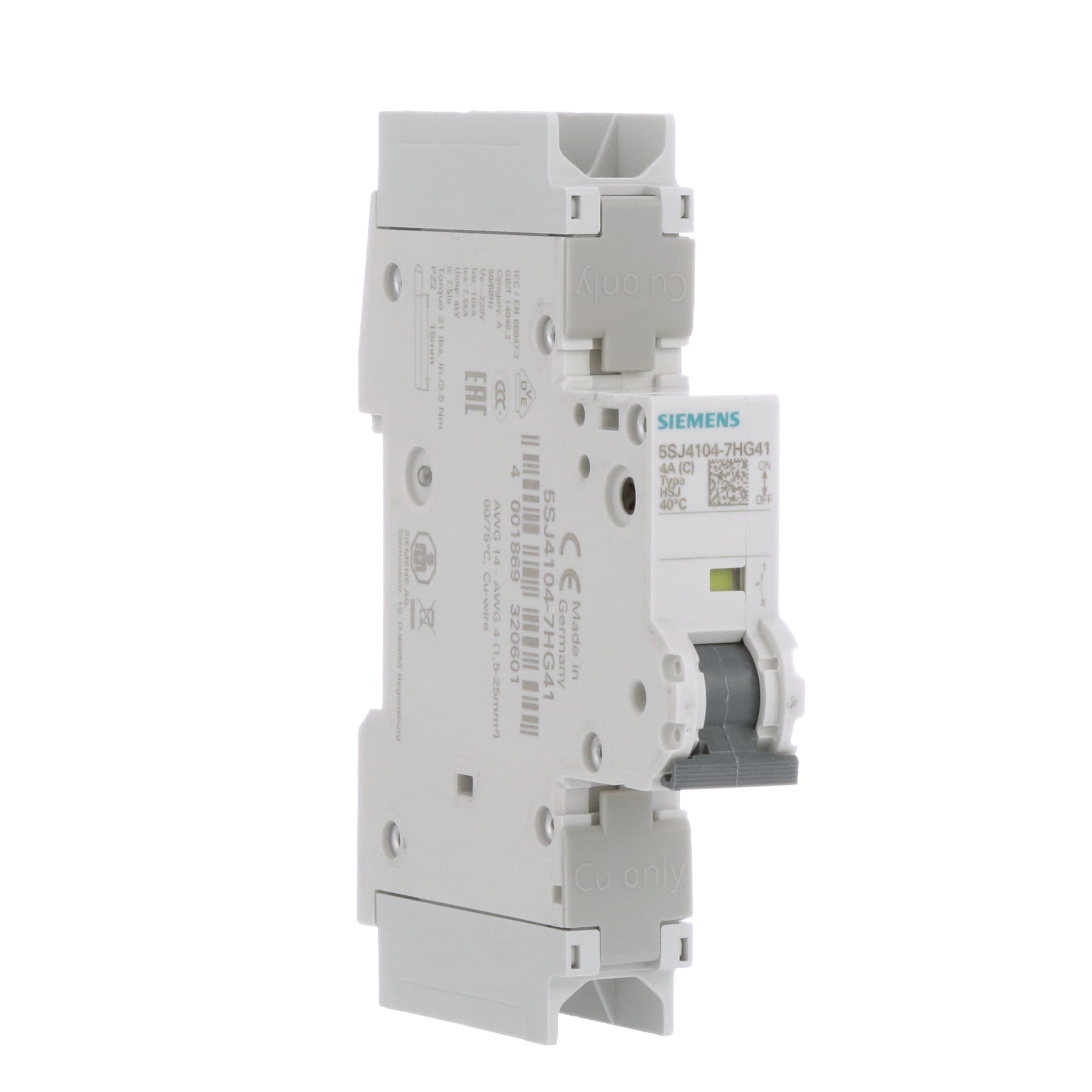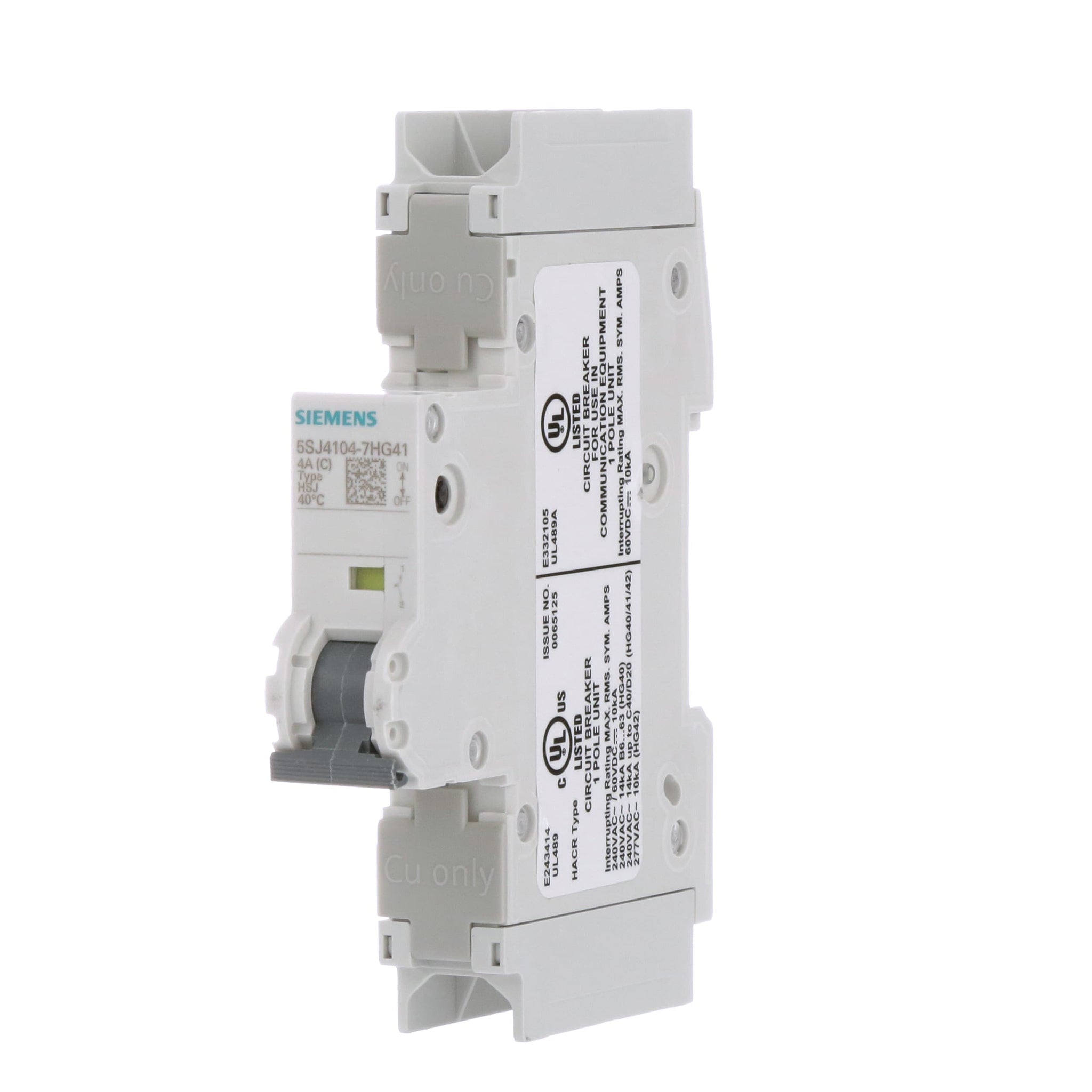 Siemen's 5SJ4 HG4 Miniature Circuit Breakers (mCB) are 1-, 2- and 3-pole thermal / magnetic overcurrent protection devices that are intended for general industrial use such as Branch Circuit and Feeder Protection. They are UL Listed (File No. E243414, Volume 1, Section 1) in accordance with UL 489, 11th edition, “Molded-Case Circuit Breakers, Molded-Case Switches and Circuit-Breaker Enclosures” and Certified to Canadian Standards (CSA 22.2 No. 5.02). They are provided with a manual means for opening the circuit and they are not ambient compensated.5SJ4 miniature circuit breakers are also CE marked according to IEC/EN 60 898 and IEC/EN 60 947-2 making them suitable for use in international applications.