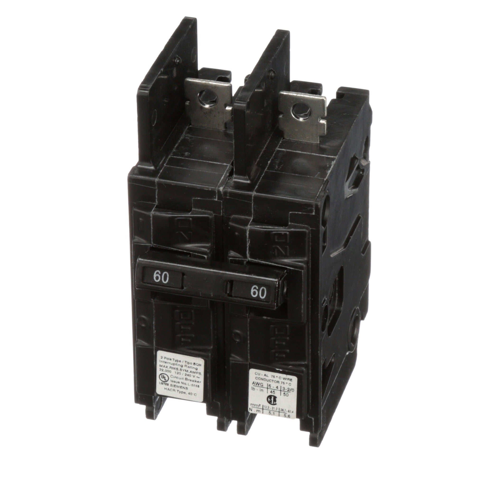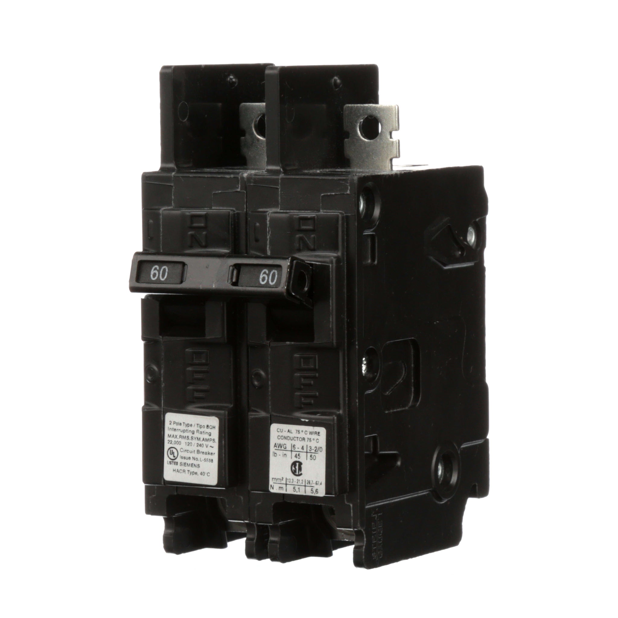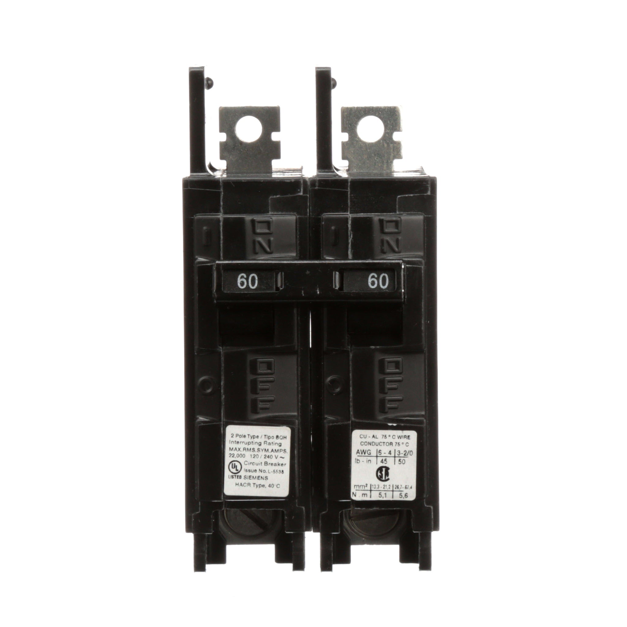 All BQ/BQH/HBQ circuit breakers are supplied with load side lugs. All standard circuit breakers are calibrated for 40°C maximum ambient application.
