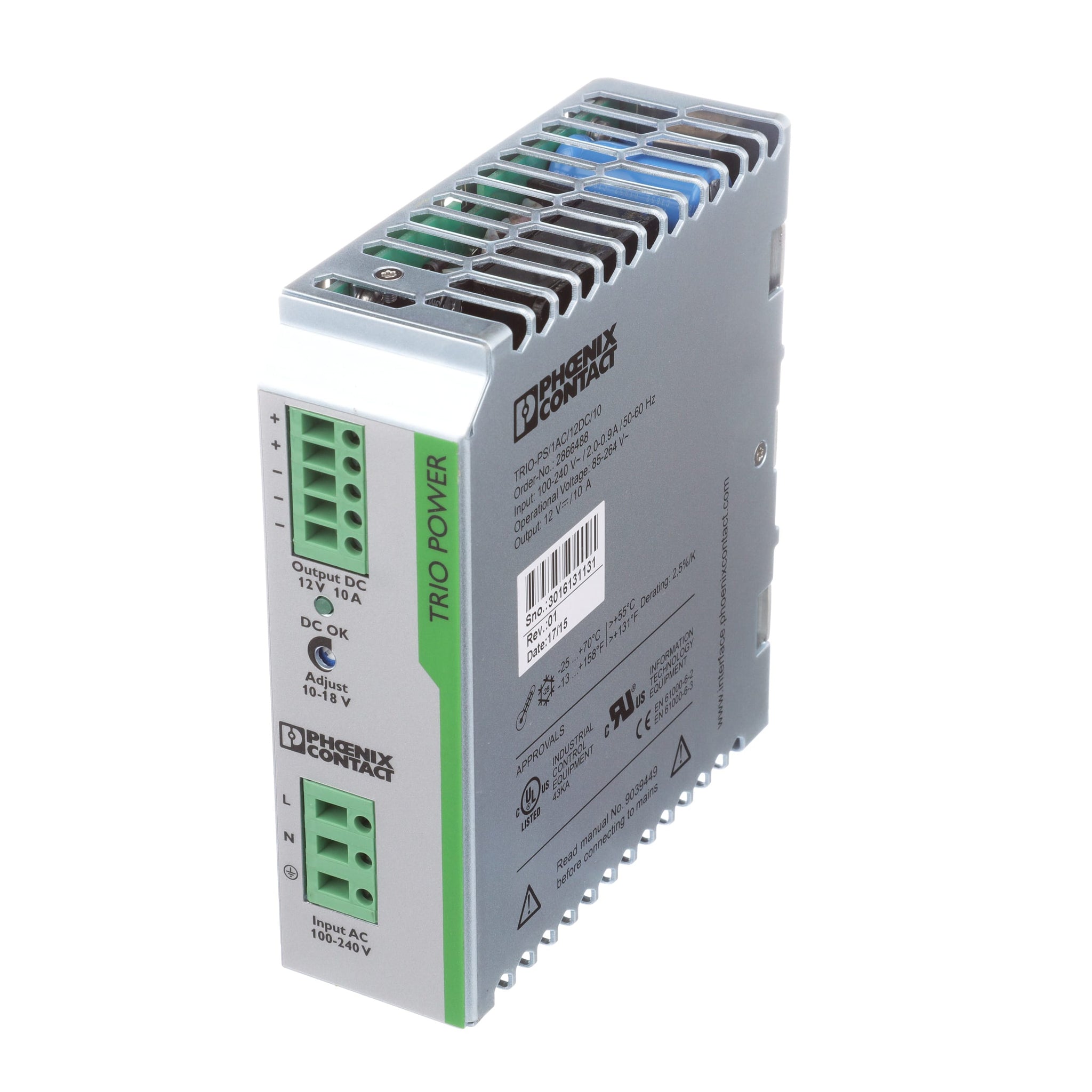 The TRIO POWER Series is particularly suited to standard machine production, thanks to 1- and 3-phase versions up to 960 W. The wide-range input and the international approval package enable worldwide use. The robust metal housing, the high electric strength, and the wide temperature range ensure a high level of power supply reliability.