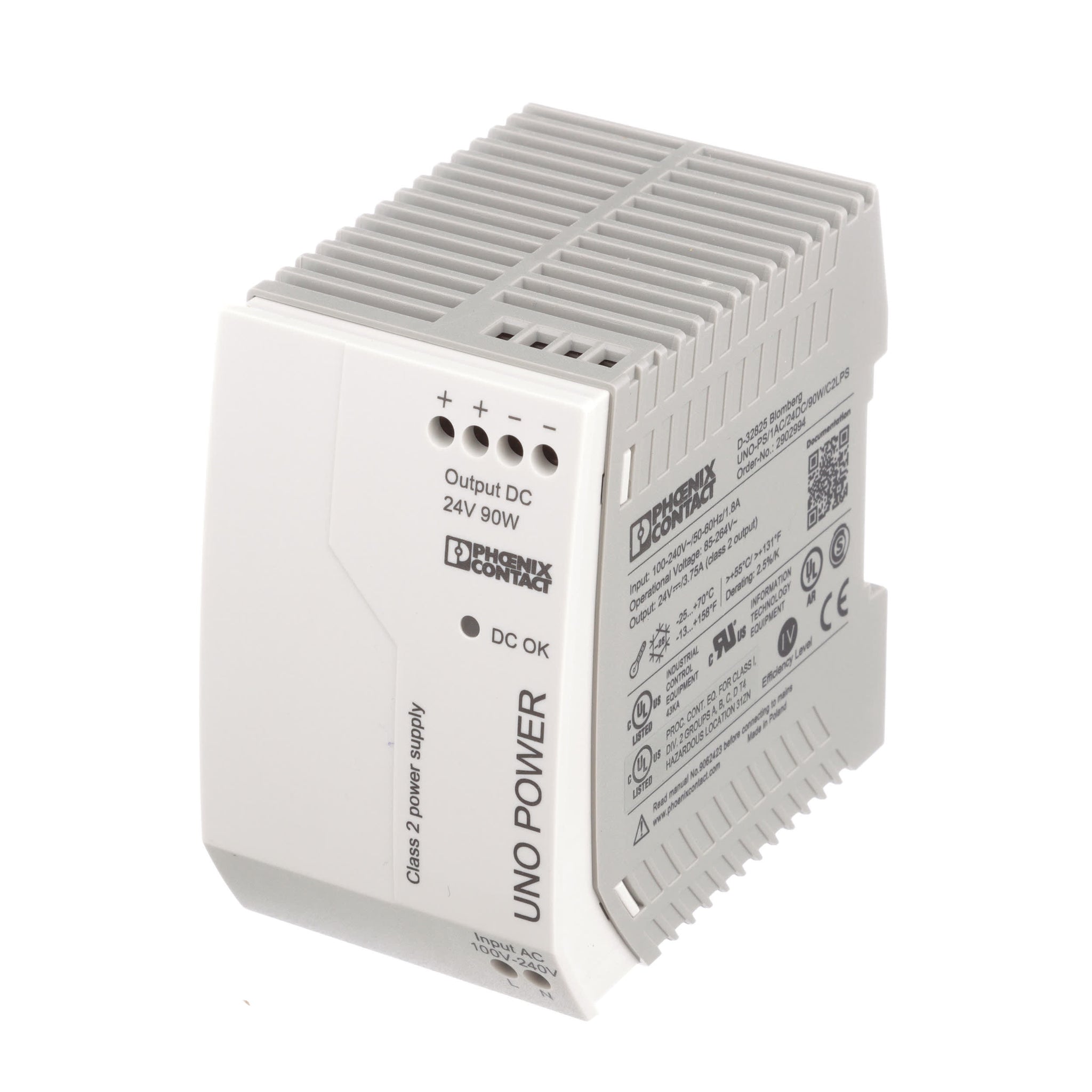 The UNO POWER product range offers performance classes ranging from 25 to 240 W at output voltages of 5 to 48 V DC. UNO POWER allows input voltages from 85 to 264 V AC and functions reliably even in the event of voltage fluctuations in the power supply network. In the case of higher values from 264 to 575 V AC, the 2 AC device with 24 V and 90 W is used. Two devices with the designation C2LPS are certified according to UL 1310/508 Listed Class 2 and are ideal for the American market. Thanks to the wide range of products and the temperature range from -25°C to +70°C, the devices support flexible use.